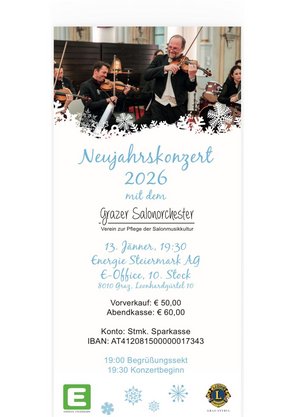 Unser Lions-Club veranstaltete am 13.01.2026 das bereits traditionelle Lions-Neujahrskonzert mit dem "Grazer Salonorchester" und mehr als 120 geladenen Gästen in den Räumen der Energie Steiermark AG in Graz. Die Einnahmen dieser Benefiz-Lions-Veranstaltung sind ein wichtiger Teil zur Finanzierung unserer sozialen Vorhaben, dieses Jahr ein Schwerpunkt, die finanzielle Unterstützung zur Ausbildung und Übergabe eines dringend benötigten Blindenführhundes.